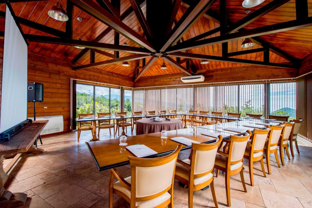 - Salle de réunion de 30 personnes équipée de mobiliers confortables, d’un grand écran, climatisation et dispose d’une vue panoramique sur le domaine des Cerfs et l’Océan Indien.